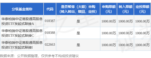 证券之星消息,1月27日华泰柏瑞基金管理有限公司发布《华泰柏瑞中证港股通高股息投资交易型开放式指数证券投资基金发起式联接基金暂停大额申购(含转换转入、定期定额投资)业务的公告》。公告中提示,为保证本基金的稳定运作,保护基金份额持有人利益,自2026年1月27日起华泰柏瑞中证港股通高股息投资交易型开放式指数证券投资基金发起式联接基金暂停大额申购(含转换转入、定期定额投资)业务,申购、转换转入上限金额为1000.0万元,下属分级基金调整明细如下: