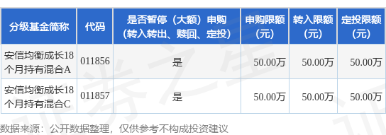 注:(1)安信均衡成长18个月持有期混合型证券投资基金(以下简称“本基金”)限制大额申购、大额转换转入、大额定期定额投资金额为:不超过500,000元(含500,000元)。