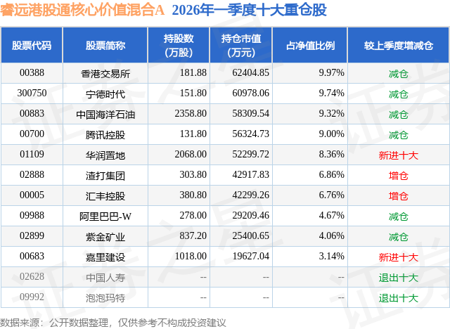 从基金规模来看,睿远港股通核心价值混合A基金2026年一季度公布的基金规模为32.71亿元。该基金最新一期资产配置为:股票占净值比90.96%,债券占净值比5.18%,现金占净值比1.49%。从基金持仓来看,该基金当季前十大股票仓位达71.88%,第一大重仓股为香港交易所(00388),持仓占比为9.97%。