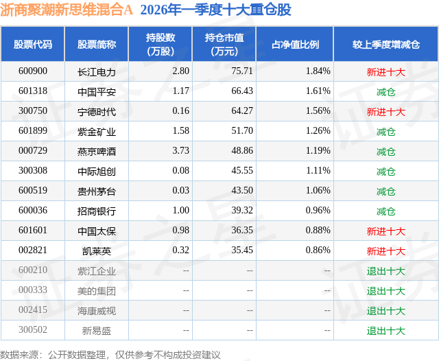 从基金规模来看,浙商聚潮新思维混合A基金2026年一季度公布的基金规模为0.4亿元,较上一期规模5862.47万元变化了-1911.59万元,环比变化了-32.61%。该基金最新一期资产配置为:股票占净值比68.94%,债券占净值比8.68%,现金占净值比22.79%。从基金持仓来看,该基金当季前十大股票仓位达12.33%,第一大重仓股为长江电力(600900),持仓占比为1.84%。