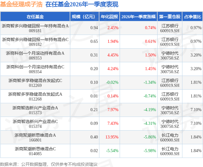 证券之星消息,日前浙商聚潮新思维混合A基金公布一季报,2026年一季度最新规模0.4亿元,季度净值涨幅为-5.86%。