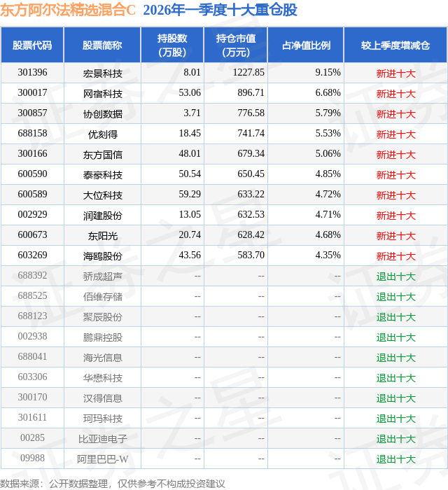从基金规模来看,东方阿尔法精选混合C基金2026年一季度公布的基金规模为0.34亿元,较上一期规模4247.13万元变化了-869.15万元,环比变化了-20.46%。该基金最新一期资产配置为:股票占净值比93.98%,债券占净值比5.78%,现金占净值比3.56%。从基金持仓来看,该基金当季前十大股票仓位达55.52%,第一大重仓股为宏景科技(301396),持仓占比为9.15%。