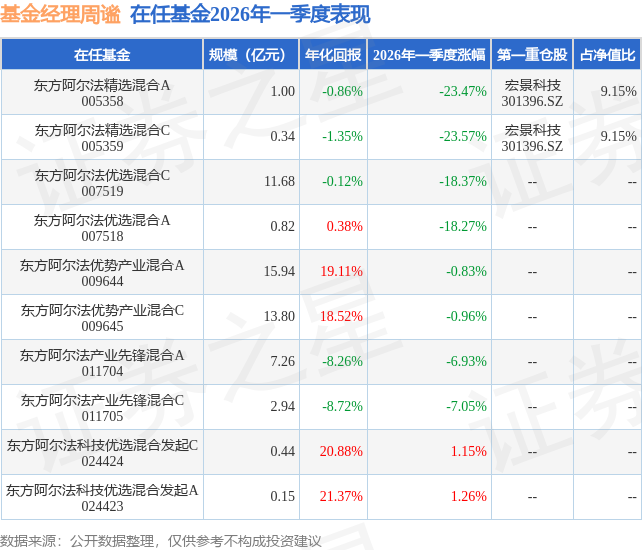 证券之星消息,日前东方阿尔法精选混合C基金公布一季报,2026年一季度最新规模0.34亿元,季度净值涨幅为-23.57%。