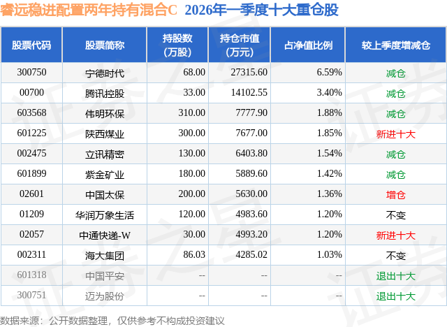 从基金规模来看,睿远稳进配置两年持有混合C基金2026年一季度公布的基金规模为13.67亿元,较上一期规模20.21亿元变化了-6.54亿元,环比变化了-32.37%。该基金最新一期资产配置为:股票占净值比36.37%,债券占净值比59.05%,现金占净值比0.94%。从基金持仓来看,该基金当季前十大股票仓位达21.47%,第一大重仓股为宁德时代(300750),持仓占比为6.59%。