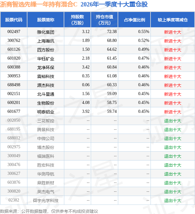 从基金规模来看,浙商智选先锋一年持有混合C基金2026年一季度公布的基金规模为0.05亿元,较上一期规模3000.26万元变化了-2491.55万元,环比变化了-83.04%。该基金最新一期资产配置为:股票占净值比88.13%,债券占净值比3.07%,现金占净值比4.04%。从基金持仓来看,该基金当季前十大股票仓位达4.76%,第一大重仓股为雅化集团(002497),持仓占比为0.55%。