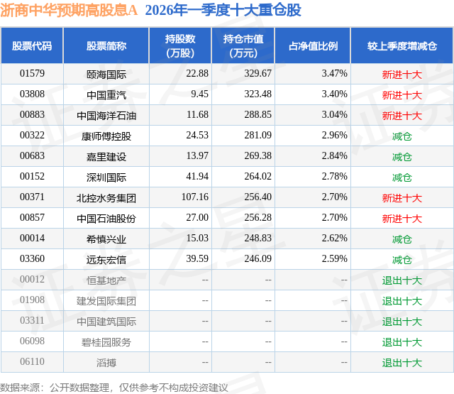 从基金规模来看,浙商中华预期高股息A基金2026年一季度公布的基金规模为0.72亿元,较上一期规模1.56亿元变化了-8354.17万元,环比变化了-53.64%。该基金最新一期资产配置为:股票占净值比91.24%,债券占净值比6.36%,现金占净值比0.97%。从基金持仓来看,该基金当季前十大股票仓位达29.1%,第一大重仓股为颐海国际(01579),持仓占比为3.47%。