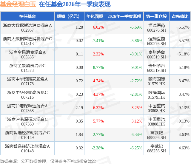浙商中华预期高股息A现任基金经理为刘雅清 白玉,本季度增聘基金经理白玉、刘雅清,近期离任的基金经理为胡羿。其中在任基金经理白玉已从业4年又279天,2025年8月28日正式接手管理浙商中华预期高股息A,任职期间累计回报为3.08%。目前还管理着10只基金产品(包括A类和C类),其中本季度表现最佳的基金为浙商沪港深精选混合A(007368),季度净值涨幅为3.25%。