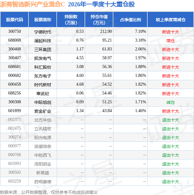 从基金规模来看,浙商智选新兴产业混合C基金2026年一季度公布的基金规模为0.09亿元,较上一期规模2761.25万元变化了-1846.84万元,环比变化了-66.88%。该基金最新一期资产配置为:股票占净值比87.48%,债券占净值比2.01%,现金占净值比8.9%。从基金持仓来看,该基金当季前十大股票仓位达24.86%,第一大重仓股为宁德时代(300750),持仓占比为7.1%。