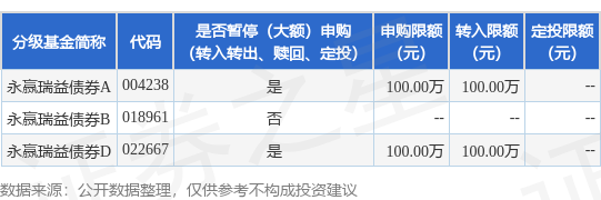证券之星消息,4月21日永赢基金管理有限公司发布《永赢瑞益债券型证券投资基金暂停机构投资者大额申购(含定期定额投资)、转换转入业务的公告》。公告中提示,为保障基金平稳运作,根据《永赢瑞益债券型证券投资基金基金合同》的有关规定,自2026年4月21日起永赢瑞益债券型证券投资基金暂停机构投资者大额申购(含定期定额投资)、转换转入业务,申购、转换转入上限金额为100.0万元,下属分级基金调整明细如下: