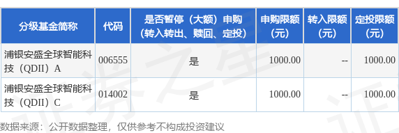 注:根据法律法规和基金合同的相关规定,浦银安盛基金管理有限公司(以下简称“本公司”或“基金管理人”)决定自2026年4月22日起,浦银安盛全球智能科技股票型证券投资基金(QDII)(以下简称“本基金”)单日单个基金账户累计申购(含申购、定期定额投资,A、C份额分别计算)金额限额调整为1千元人民币。如单日单个基金账号单笔申购(含申购、定期定额投资,A、C份额分别计算)本基金的金额超过1千元人民币,则1千元人民币确认成功,超过1千元人民币金额的部分确认失败;如单日单个基金账号多笔累计申购(含申购、定期定额投资,A、C份额分别计算)本基金的金额超过1千元人民币,基金管理人将对逐笔累加至符合不超过1千元人民币限额的申请确认成功,其余部分确认失败。