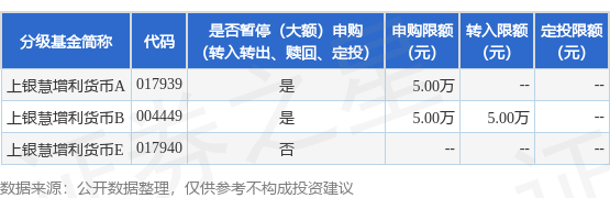 证券之星消息,4月21日上银基金管理有限公司发布《上银慧增利货币市场基金A类基金份额、B类基金份额调整代销渠道大额申购、转换转入及定期定额投资业务限额的公告》。公告中提示,为了保证基金的平稳运作,保护基金持有人的利益,自2026年4月23日起上银慧增利货币市场基金A类基金份额、B类基金份额调整代销渠道大额申购、转换转入及定期定额投资业务限额,申购、转换转入上限金额为5.0万元,下属分级基金调整明细如下: