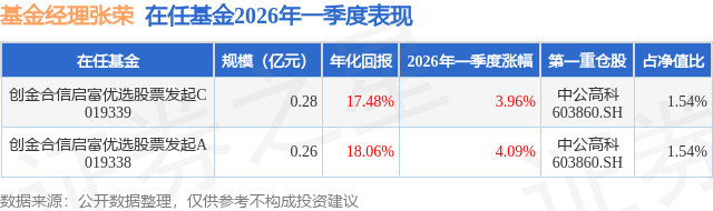 从基金规模来看,创金合信启富优选股票发起C基金2026年一季度公布的基金规模为0.28亿元,较上一期规模1894.01万元变化了885.09万元,环比变化了46.73%。该基金最新一期资产配置为:股票占净值比92.54%,债券占净值比5.29%,现金占净值比2.22%。从基金持仓来看,该基金当季前十大股票仓位达13.03%,第一大重仓股为中公高科(603860),持仓占比为1.54%。