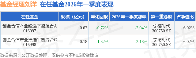 证券之星消息,日前创金合信产业臻选平衡混合C基金公布一季报,2026年一季度最新规模0.18亿元,季度净值涨幅为-2.18%。