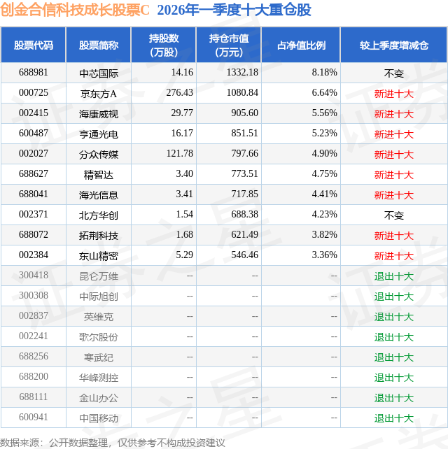 从基金规模来看,创金合信科技成长股票C基金2026年一季度公布的基金规模为0.52亿元,较上一期规模1.32亿元变化了-7955.12万元,环比变化了-60.28%。该基金最新一期资产配置为:股票占净值比85.9%,债券占净值比5.26%,现金占净值比9.1%。从基金持仓来看,该基金当季前十大股票仓位达51.08%,第一大重仓股为中芯国际(688981),持仓占比为8.18%。