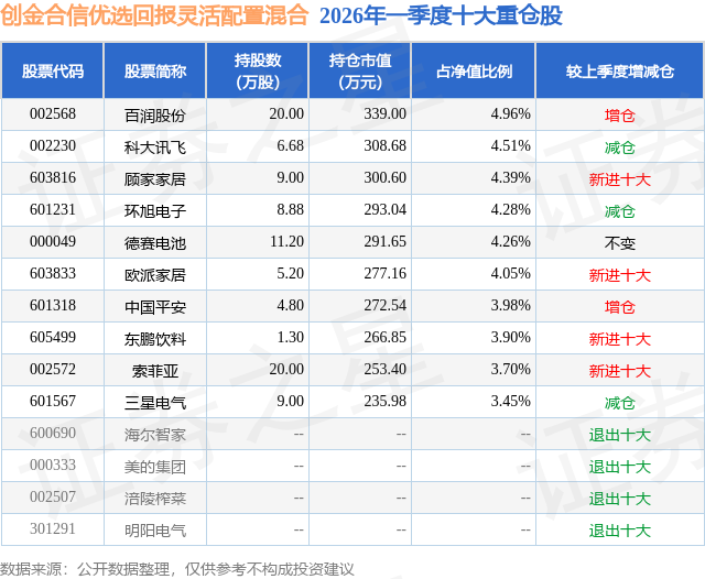 从基金规模来看,创金合信优选回报灵活配置混合基金2026年一季度公布的基金规模为0.68亿元,较上一期规模1.08亿元变化了-3952.16万元,环比变化了-36.62%。该基金最新一期资产配置为:股票占净值比86.36%,无债券类资产,现金占净值比12.09%。从基金持仓来看,该基金当季前十大股票仓位达41.48%,第一大重仓股为百润股份(002568),持仓占比为4.96%。