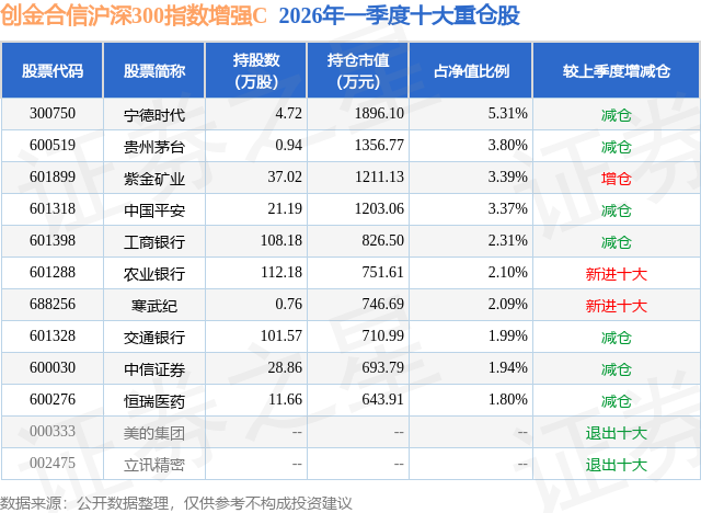 从基金规模来看,创金合信沪深300指数增强C基金2026年一季度公布的基金规模为2.45亿元,较上一期规模4.02亿元变化了-1.57亿元,环比变化了-39.14%。该基金最新一期资产配置为:股票占净值比91.77%,债券占净值比3.92%,现金占净值比4.77%。从基金持仓来看,该基金当季前十大股票仓位达28.1%,第一大重仓股为宁德时代(300750),持仓占比为5.31%。