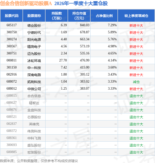 从基金规模来看,创金合信创新驱动股票A基金2026年一季度公布的基金规模为0.71亿元,较上一期规模6430.73万元变化了665.68万元,环比变化了10.35%。该基金最新一期资产配置为:股票占净值比89.2%,无债券类资产,现金占净值比9.37%。从基金持仓来看,该基金当季前十大股票仓位达46.4%,第一大重仓股为德业股份(605117),持仓占比为7.29%。