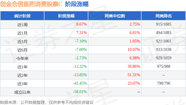从业绩表现来看,创金合信医药消费股票C基金过去一年净值涨幅为-12.32%,在同类基金中排名975/988,同类基金过去一年净值涨幅中位数为39.86%。而基金过去一年的最大回撤为-28.79%,成立以来的最大回撤为-66.71%。