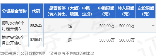 证券之星消息,4月22日博时基金管理有限公司发布《博时安怡6个月定期开放债券型证券投资基金暂停大额申购、转换转入、定期定额投资业务的公告》。公告中提示,为保护基金份额持有人利益,自2026年4月22日起博时安怡6个月定期开放债券型证券投资基金暂停大额申购、转换转入、定期定额投资业务,申购、转换转入上限金额为500.0万元,下属分级基金调整明细如下: