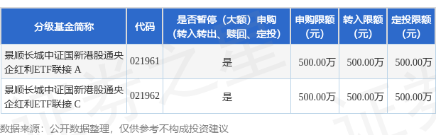证券之星消息,4月22日景顺长城基金管理有限公司发布《关于景顺长城中证国新港股通央企红利交易型开放式指数证券投资基金联接基金暂停接受伍佰万元以上申购(含日常申购和定期定额申购)及转换转入业务的公告》。公告中提示,为保护基金份额持有人利益,保障基金平稳运作,自2026年4月22日起景顺长城中证国新港股通央企红利交易型开放式指数证券投资基金联接基金暂停接受伍佰万元以上申购(含日常申购和定期定额申购)及转换转入业务,申购、转换转入上限金额为500.0万元,下属分级基金调整明细如下:
