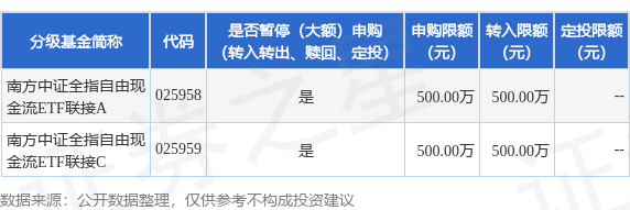 证券之星消息,4月22日南方基金管理股份有限公司发布《南方中证全指自由现金流交易型开放式指数证券投资基金联接基金限制大额申购、定投和转换转入业务的公告》。公告中提示,为保护基金份额持有人的利益,自2026年4月22日起南方中证全指自由现金流交易型开放式指数证券投资基金联接基金限制大额申购、定投和转换转入业务,申购、转换转入上限金额为500.0万元,下属分级基金调整明细如下: