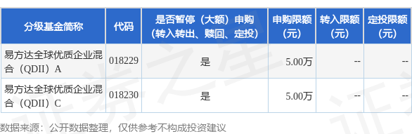 注:(1) 本次暂停相关业务针对易方达全球优质企业混合型证券投资基金(QDII)(以下简称“本基金”)所有基金份额类别(A类人民币份额基金代码为018229,A类美元现汇份额基金代码为018231,C类人民币份额基金代码为018230,C类美元现汇份额基金代码为018232)。