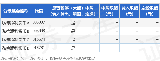 证券之星消息,4月22日泓德基金管理有限公司发布《泓德基金管理有限公司关于泓德添利货币市场基金暂停代销机构申购、转换转入、定期定额投资业务的公告》。公告中提示,为保证基金的稳定运作,保护基金份额持有人利益,自2026年4月23日起泓德基金管理有限公司关于泓德添利货币市场基金暂停代销机构申购、转换转入、定期定额投资业务,下属分级基金调整明细如下: