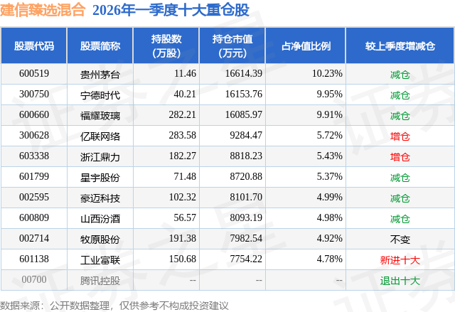 从基金规模来看,建信臻选混合基金2026年一季度公布的基金规模为16.24亿元,较上一期规模22.16亿元变化了-5.92亿元,环比变化了-26.73%。该基金最新一期资产配置为:股票占净值比77.93%,无债券类资产,现金占净值比22.25%。从基金持仓来看,该基金当季前十大股票仓位达66.28%,第一大重仓股为贵州茅台(600519),持仓占比为10.23%。