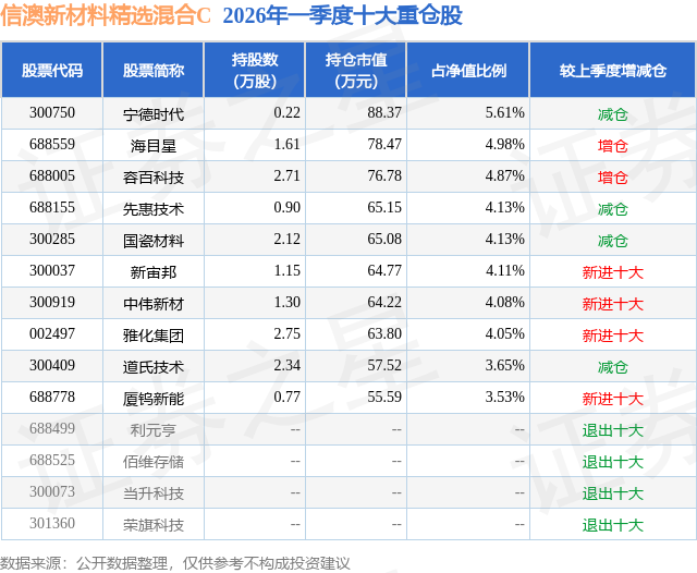 从基金规模来看,信澳新材料精选混合C基金2026年一季度公布的基金规模为0.07亿元,较上一期规模175.05万元变化了479.85万元,环比变化了274.12%。该基金最新一期资产配置为:股票占净值比79.24%,无债券类资产,现金占净值比19.46%。从基金持仓来看,该基金当季前十大股票仓位达43.14%,第一大重仓股为宁德时代(300750),持仓占比为5.61%。