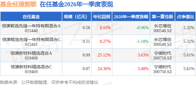 证券之星消息,日前信澳新材料精选混合C基金公布一季报,2026年一季度最新规模0.07亿元,季度净值涨幅为3.48%。