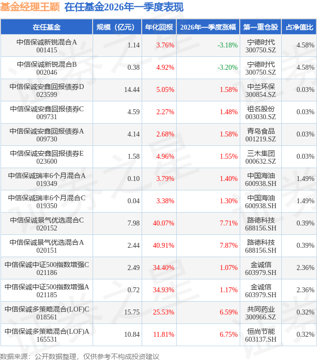 证券之星消息,日前中信保诚瑞丰6个月混合A基金公布一季报,2026年一季度最新规模0.1亿元,季度净值涨幅为1.4%。