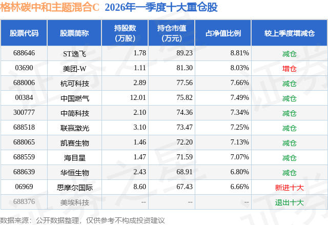 从基金规模来看,格林碳中和主题混合C基金2026年一季度公布的基金规模为0.04亿元,较上一期规模129.57万元变化了240.3万元,环比变化了185.46%。该基金最新一期资产配置为:股票占净值比94.46%,无债券类资产,现金占净值比7.74%。从基金持仓来看,该基金当季前十大股票仓位达74.24%,第一大重仓股为ST逸飞(688646),持仓占比为8.81%。
