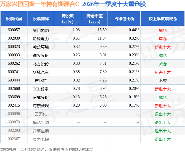 从基金规模来看,万家兴恒回报一年持有期混合C基金2026年一季度公布的基金规模为0.02亿元,较上一期规模1073.88万元变化了-824.66万元,环比变化了-76.79%。该基金最新一期资产配置为:股票占净值比11.72%,债券占净值比93.1%,现金占净值比3.79%。从基金持仓来看,该基金当季前十大股票仓位达2.44%,第一大重仓股为厦门象屿(600057),持仓占比为0.44%。