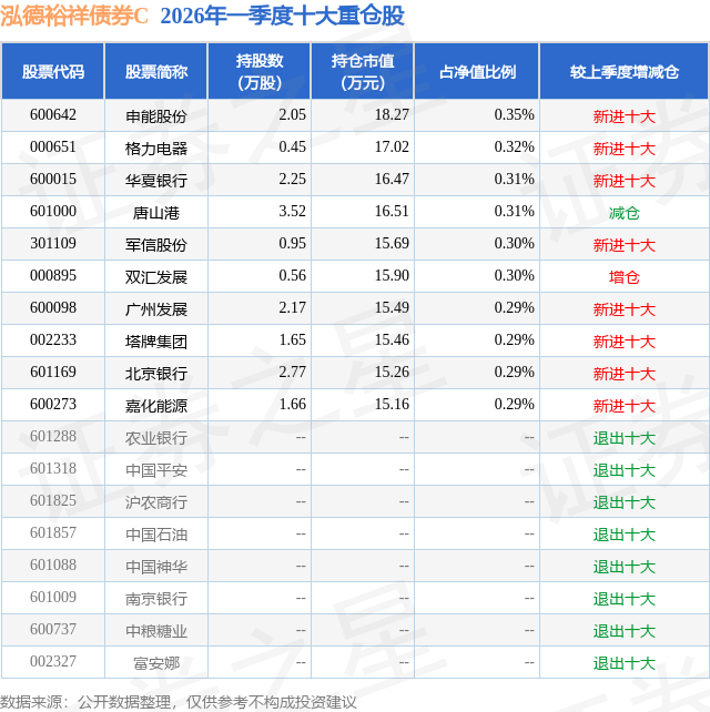 从基金规模来看,泓德裕祥债券C基金2026年一季度公布的基金规模为0.03亿元,较上一期规模842.99万元变化了-516.31万元,环比变化了-61.25%。该基金最新一期资产配置为:股票占净值比18.73%,债券占净值比81.23%,现金占净值比0.37%。从基金持仓来看,该基金当季前十大股票仓位达3.05%,第一大重仓股为申能股份(600642),持仓占比为0.35%。
