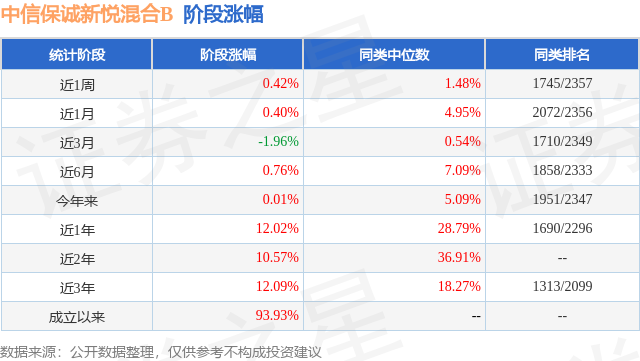 从业绩表现来看,中信保诚新悦混合B基金过去一年净值涨幅为12.02%,在同类基金中排名1690/2296,同类基金过去一年净值涨幅中位数为28.79%。而基金过去一年的最大回撤为-7.58%,成立以来的最大回撤为-8.16%。