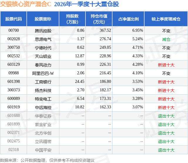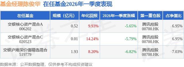 证券之星消息,日前交银核心资产混合C基金公布一季报,2026年一季度最新规模0.01亿元,季度净值涨幅为-5.79%。