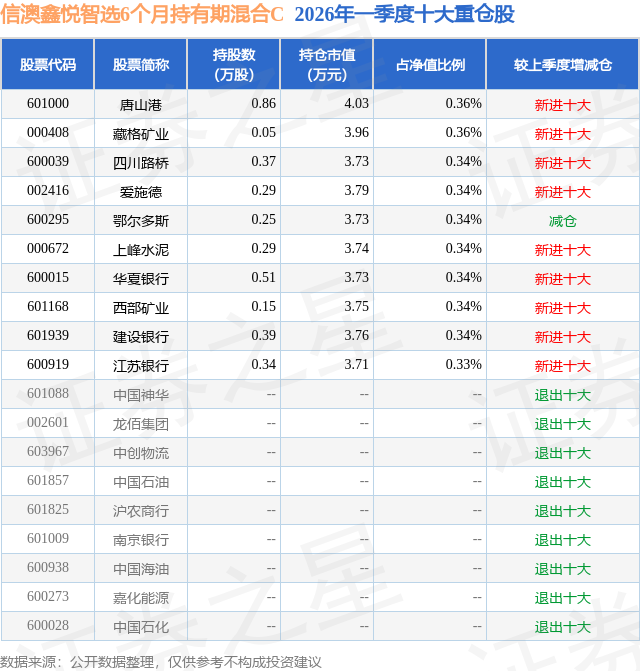 从基金规模来看,信澳鑫悦智选6个月持有期混合C基金2026年一季度公布的基金规模为0.1亿元,较上一期规模1487.99万元变化了-480.13万元,环比变化了-32.27%。该基金最新一期资产配置为:股票占净值比15.46%,债券占净值比57.67%,现金占净值比8.59%。从基金持仓来看,该基金当季前十大股票仓位达3.43%,第一大重仓股为唐山港(601000),持仓占比为0.36%。