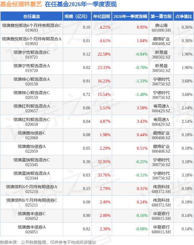证券之星消息,日前信澳鑫悦智选6个月持有期混合C基金公布一季报,2026年一季度最新规模0.1亿元,季度净值涨幅为0.95%。