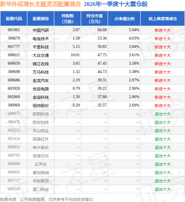 从基金规模来看,新华外延增长主题灵活配置混合基金2026年一季度公布的基金规模为0.13亿元,较上一期规模1.72亿元变化了-1.58亿元,环比变化了-92.29%。该基金最新一期资产配置为:股票占净值比89.83%,无债券类资产,现金占净值比13.99%。从基金持仓来看,该基金当季前十大股票仓位达34.96%,第一大重仓股为中国汽研(601965),持仓占比为5.04%。