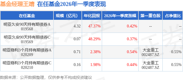 明亚稳利3个月持有期债券A现任基金经理为何明 王靖 韩俏,本季度增聘基金经理王靖、韩俏,近期离任的基金经理为赵鑫岱。其中在任基金经理王靖已从业9年又116天,2026年2月5日正式接手管理明亚稳利3个月持有期债券A,任职期间累计回报为0.45%。目前还管理着4只基金产品(包括A类和C类),其中本季度表现最佳的基金为明亚稳利3个月持有期债券A(020209),季度净值涨幅为0.54%。