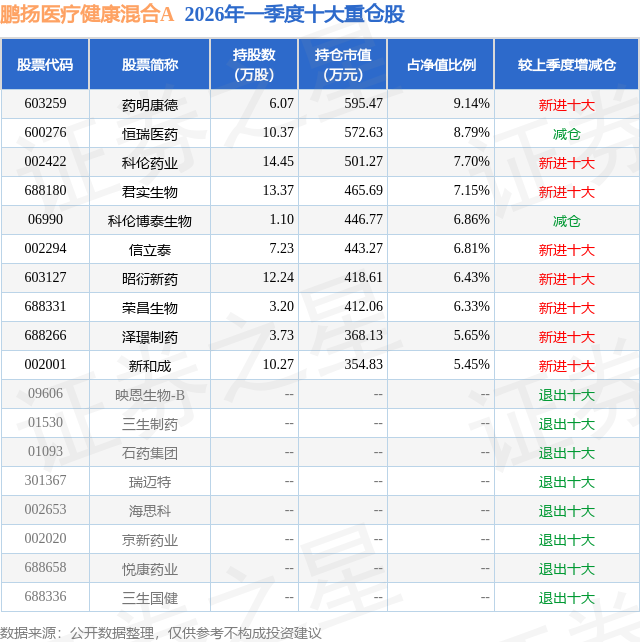 证券之星消息,日前鹏扬医疗健康混合A基金公布一季报,2026年一季度最新规模0.1亿元,季度净值涨幅为-2.14%。