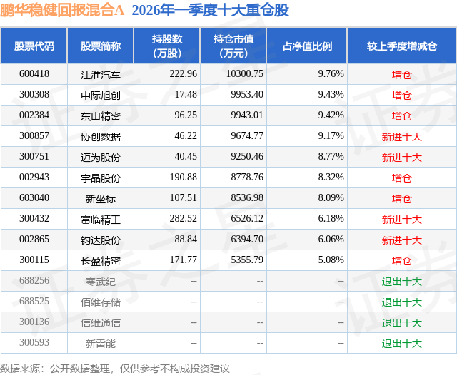 从基金规模来看,鹏华稳健回报混合A基金2026年一季度公布的基金规模为5.42亿元,较上一期规模1.89亿元变化了3.53亿元,环比变化了186.54%。该基金最新一期资产配置为:股票占净值比94.79%,无债券类资产,现金占净值比5.92%。从基金持仓来看,该基金当季前十大股票仓位达80.28%,第一大重仓股为江淮汽车(600418),持仓占比为9.76%。
