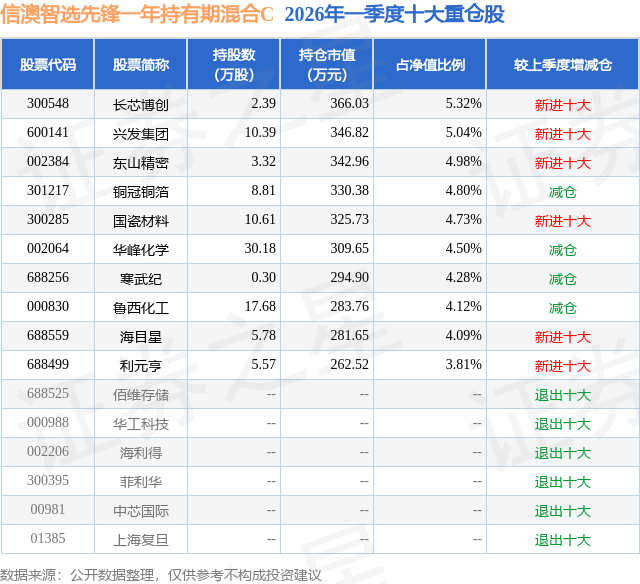从基金规模来看,信澳智选先锋一年持有期混合C基金2026年一季度公布的基金规模为0.11亿元,较上一期规模3884.7万元变化了-2826.41万元,环比变化了-72.76%。该基金最新一期资产配置为:股票占净值比81.0%,无债券类资产,现金占净值比14.06%。从基金持仓来看,该基金当季前十大股票仓位达45.67%,第一大重仓股为长芯博创(300548),持仓占比为5.32%。