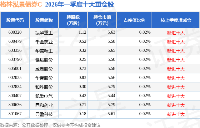 从基金规模来看,格林泓景债券C基金2026年一季度公布的基金规模为0.01亿元,较上一期规模10.85万元变化了138.66万元,环比变化了1278.03%。该基金最新一期资产配置为:股票占净值比1.83%,债券占净值比124.43%,现金占净值比2.62%。从基金持仓来看,该基金当季前十大股票仓位达0.2%,第一大重仓股为振华重工(600320),持仓占比为0.02%。