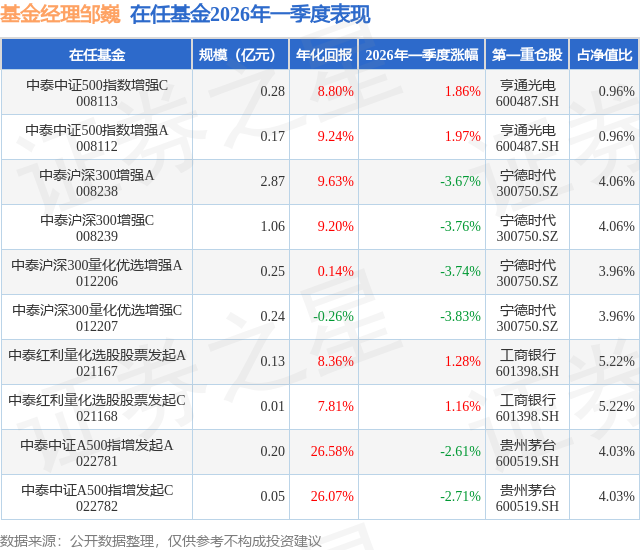 证券之星消息,日前中泰沪深300增强A基金公布一季报,2026年一季度最新规模2.87亿元,季度净值涨幅为-3.67%。