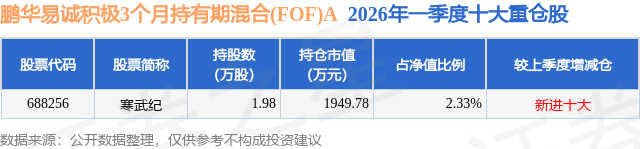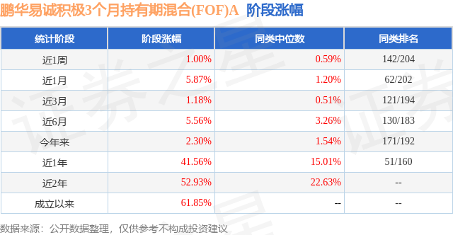 证券之星消息,日前鹏华易诚积极3个月持有期混合(FOF)A基金公布一季报,2026年一季度最新规模5.63亿元,季度净值涨幅为-2.22%。