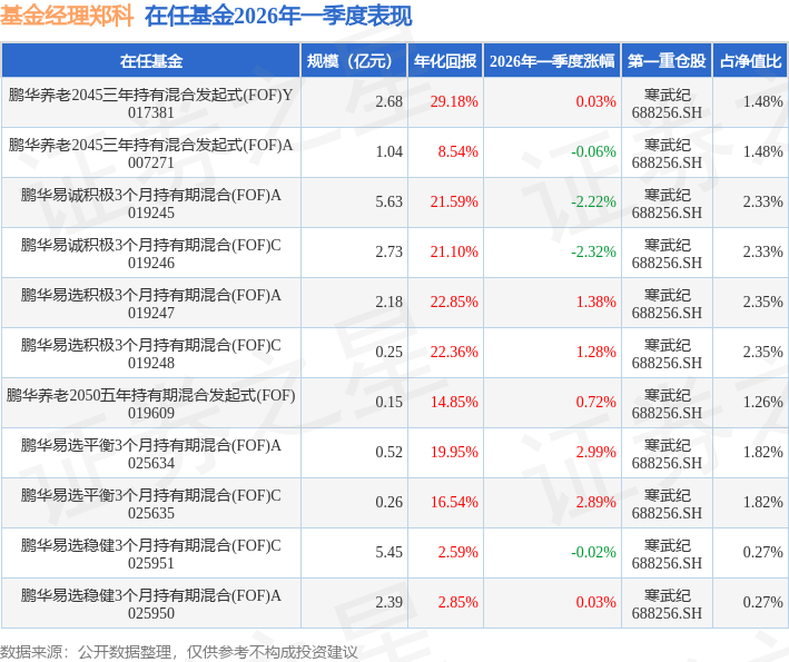 从基金规模来看,鹏华易诚积极3个月持有期混合(FOF)A基金2026年一季度公布的基金规模为5.63亿元,较上一期规模4877.17万元变化了5.14亿元,环比变化了1054.62%。该基金最新一期资产配置为:股票占净值比2.33%,债券占净值比5.29%,现金占净值比10.95%。从基金持仓来看,该基金当季前十大股票仓位达2.33%,第一大重仓股为寒武纪(688256),持仓占比为2.33%。