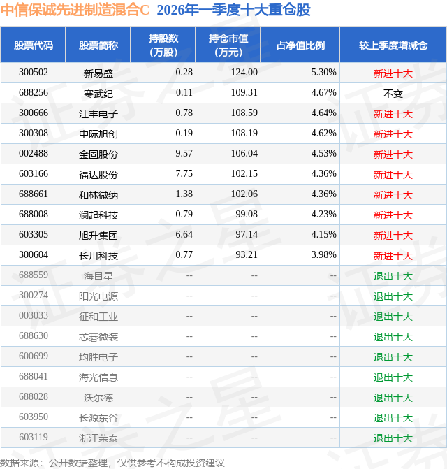 证券之星消息,日前中信保诚先进制造混合C基金公布一季报,2026年一季度最新规模0.1亿元,季度净值涨幅为5.35%。