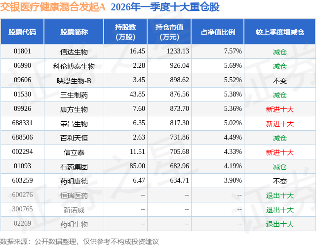 从基金规模来看,交银医疗健康混合发起A基金2026年一季度公布的基金规模为0.47亿元,较上一期规模1587.07万元变化了3162.5万元,环比变化了199.27%。该基金最新一期资产配置为:股票占净值比90.94%,无债券类资产,现金占净值比10.23%。从基金持仓来看,该基金当季前十大股票仓位达51.45%,第一大重仓股为信达生物(01801),持仓占比为7.57%。