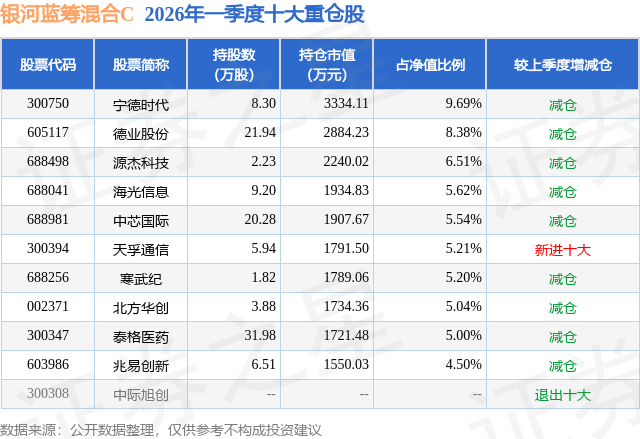 从基金规模来看,银河蓝筹混合C基金2026年一季度公布的基金规模为0.02亿元,较上一期规模176.29万元变化了-17.3万元,环比变化了-9.81%。该基金最新一期资产配置为:股票占净值比93.9%,无债券类资产,现金占净值比6.26%。从基金持仓来看,该基金当季前十大股票仓位达60.69%,第一大重仓股为宁德时代(300750),持仓占比为9.69%。